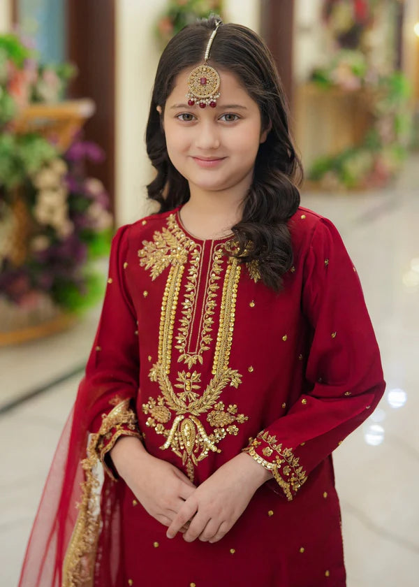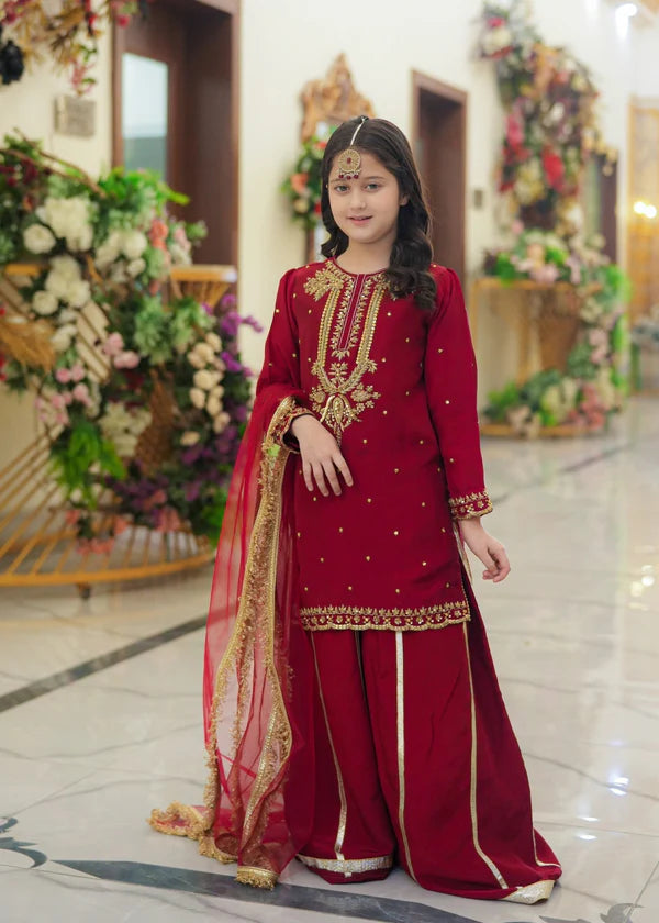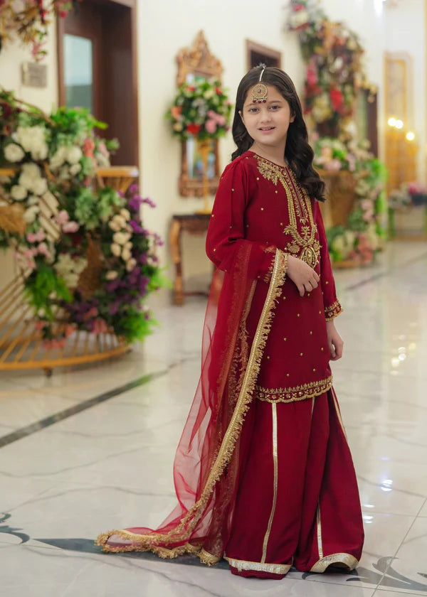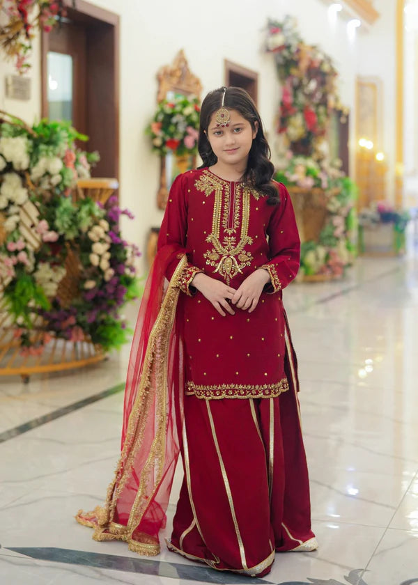 Step into timeless elegance with this maroon silk sharara set, exquisitely embellished with intricate adda work that adds a touch of festive sparkle. The rich silk fabric enhances its regal appeal, while the delicate net dupatta completes the look with graceful charm. Perfect for weddings, festive gatherings, and special celebrations, this 3-piece ensemble beautifully blends tradition, luxury, and sophistication.