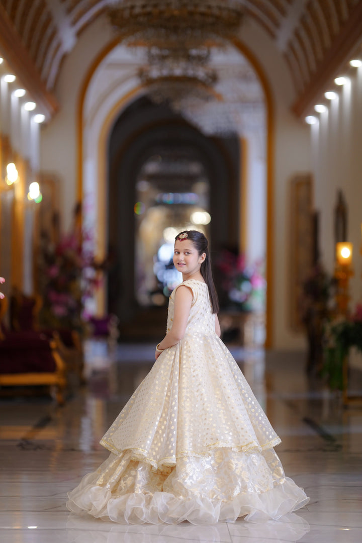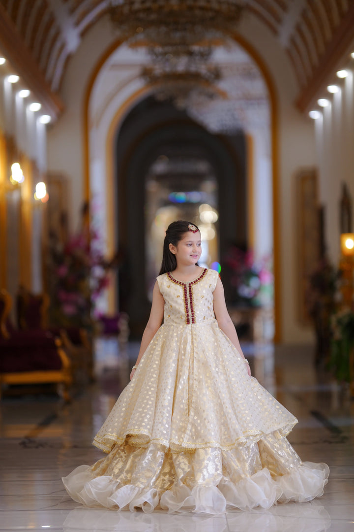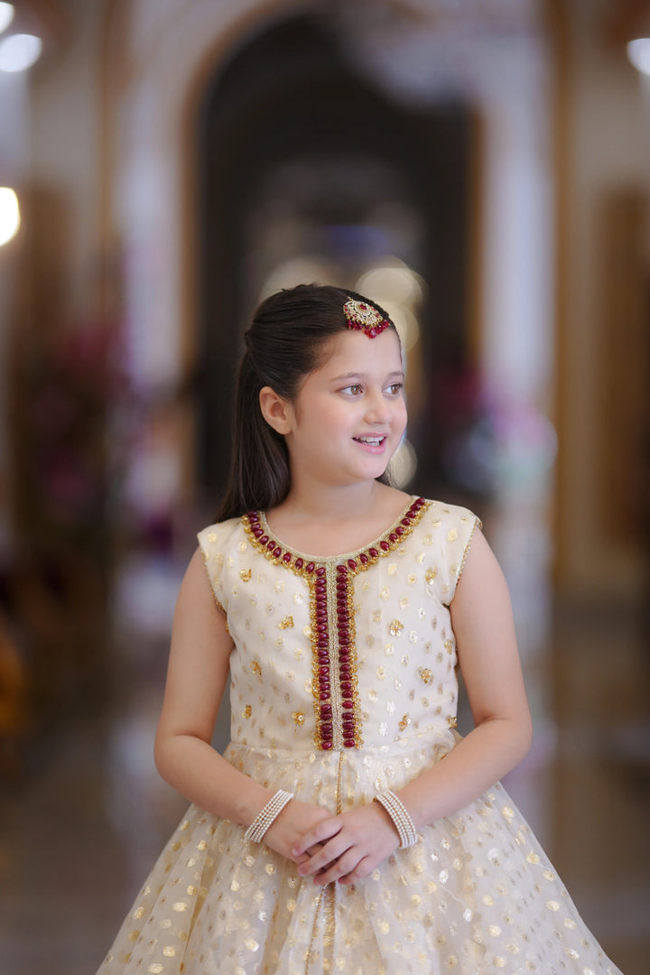 Introducing "Gulaal" by “Fairy Queen by Ayesha Hamza”, a beautiful outfit that combines an off-white Choli, Dupatta, and Lehenga. Made with care from high-quality lorus Jaal fabric & tissue with 12-yards lehnga flare, this dress is adorned with lovely red stone decorations, delicate Cutdana details, sparkling Sitaray embroidery, and elegant Tilla work. The Gulaal dress is perfect for any special occasion, ensuring your child looks and feels wonderfully stylish. Dress them in pure luxury, where every part of this outfit tells a story of charm and sophistication.