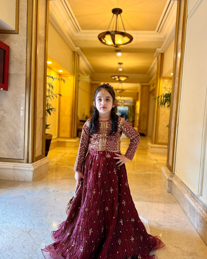 Paired With Crushed Lehanga ..Crystal Handwork On Neck And Shirts Enhance The Beauty Of Dress