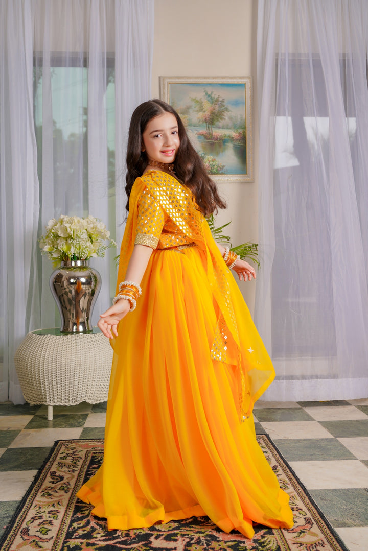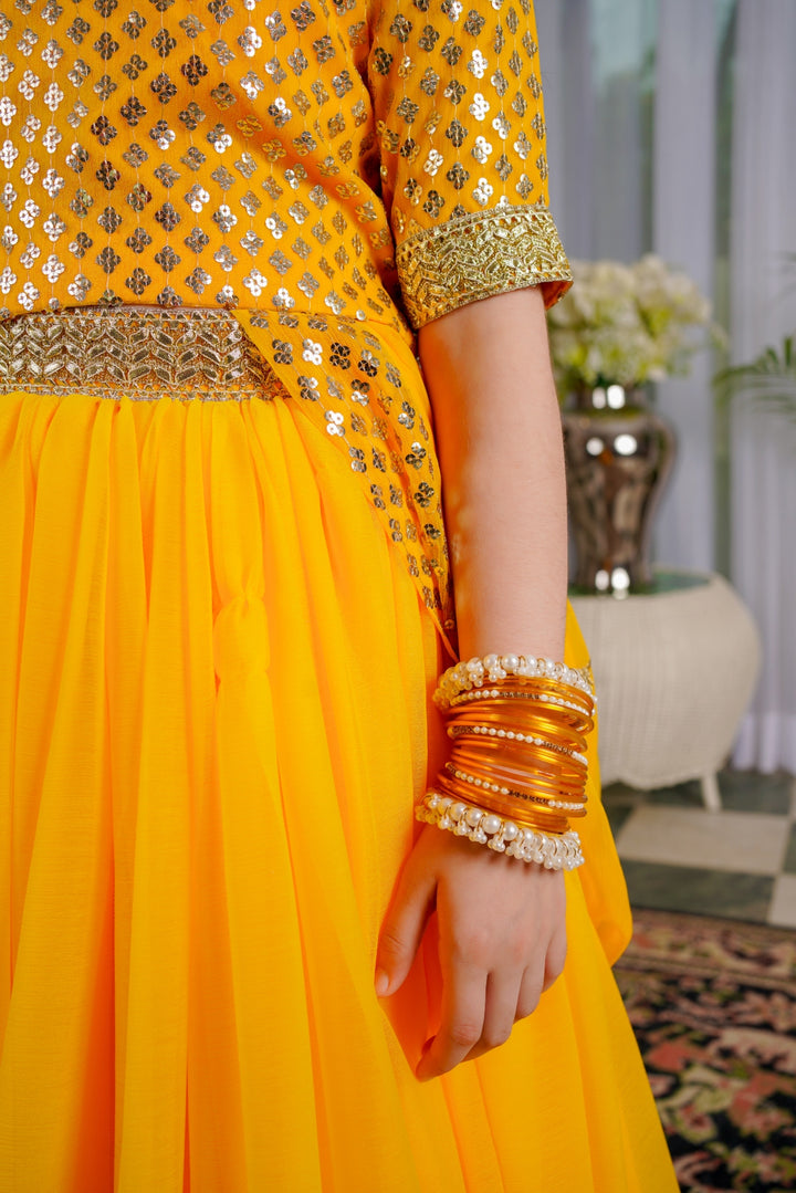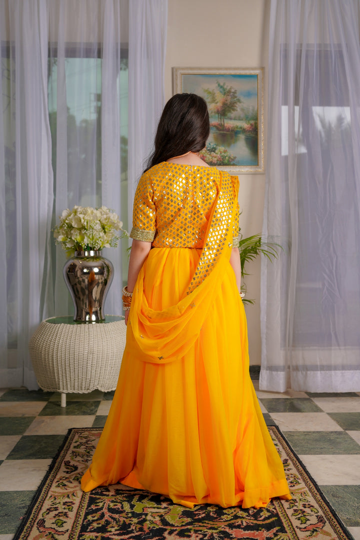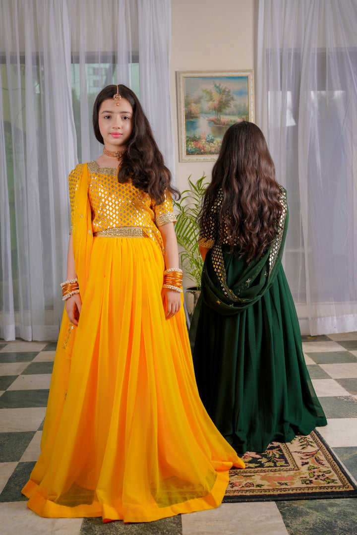Celebration of color tradition and sparkle! this full-flared chiffon lehenga in vibrant Yellow and Green is adorned with delicate sequins workon the choli and dupatta. this lehenga-choli brings joyful elegance to weddings mehndi and festive occasion.